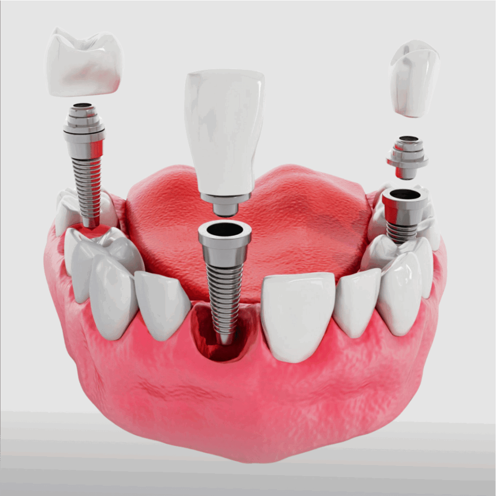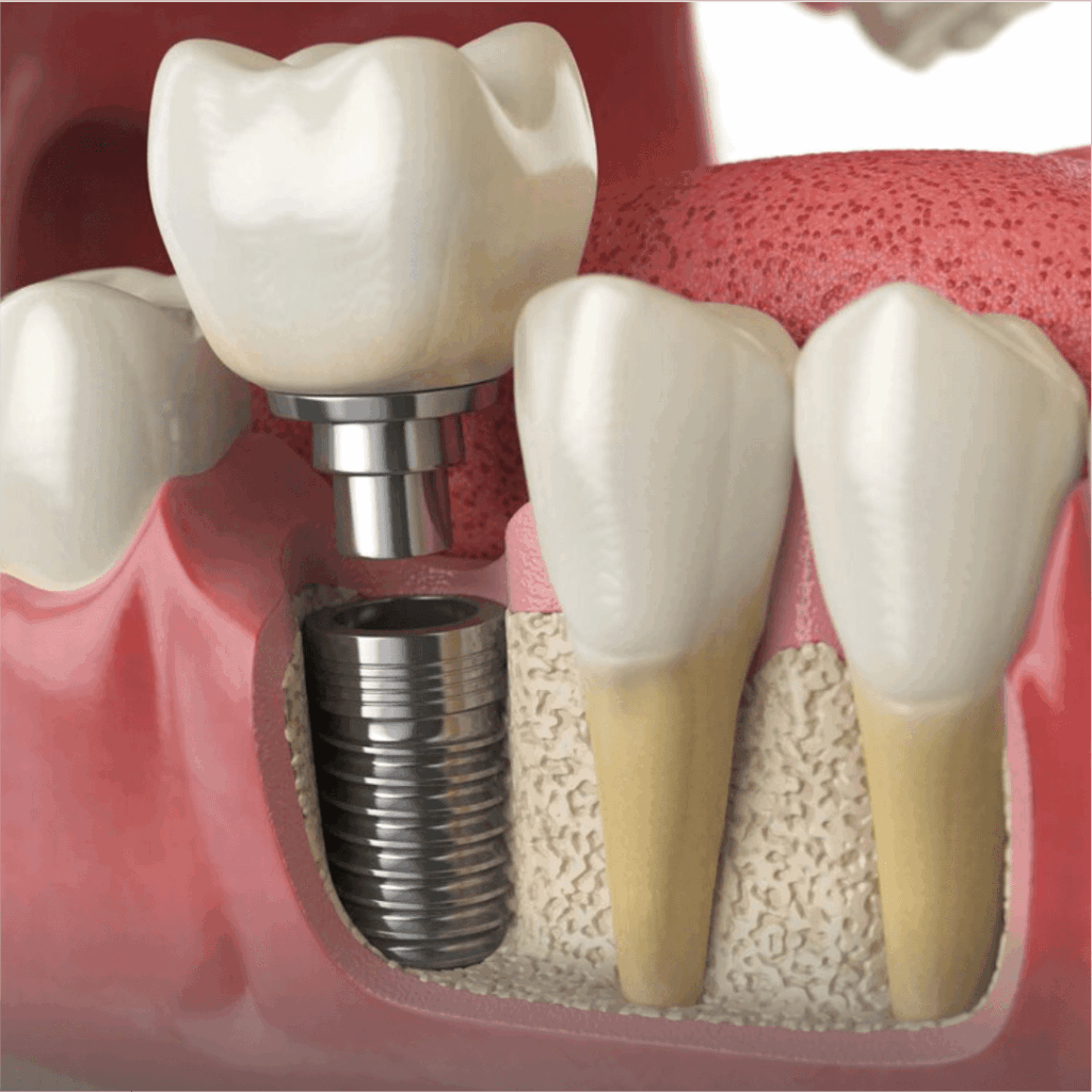 Um implante dentário é uma estrutura em titânio colocada no osso maxilar ou mandibular para substituir a raiz de um dente perdido. Sobre esse implante é fixada uma coroa (o “dente artificial”) que se assemelha perfeitamente a um dente natural — em forma, função e estética.
